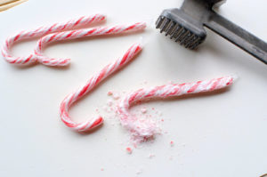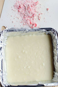 Sprinkle candy cane pieces on top of the fudge mixture.