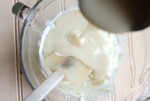 When the contents are completely smooth, stir in the can of sweetened condensed milk and mix completely.