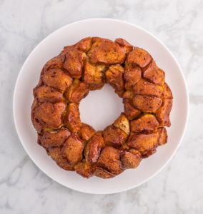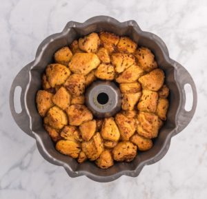 Remove the monkey bread from the oven and let it cool in the pan for about 5 minutes. This allows the caramel sauce to thicken slightly. Don’t let it cool much longer than 5 minutes, or it will be too hard to remove from the pan.