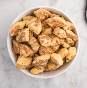 Open the cans of refrigerated cinnamon rolls and separate them. You'll have 16 individual rolls. Cut each cinnamon roll into quarters. This will give you bite-sized pieces to work with.