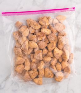 Roll each quartered cinnamon roll piece in the cinnamon-sugar mixture until it's well-coated. You can also do this by placing the sugar mixture in a zip-top bag and tossing the pieces in it for even coating.