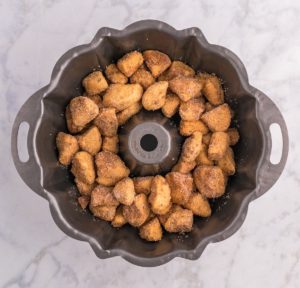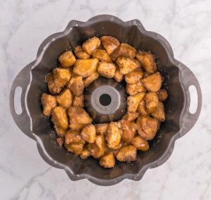 Pour this mixture evenly over the cinnamon roll pieces in the Bundt pan. Try to keep the sauce right on top of the cinnamon roll pieces and not let it run down the sides. Letting it run down the sides will make it difficult for the monkey bread to come out of the pan because a pool of caramel may form at the bottom.
