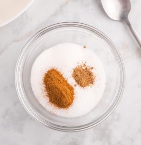 In a small bowl, mix together the granulated sugar, ground cinnamon, and nutmeg. Set this cinnamon-sugar mixture aside.