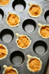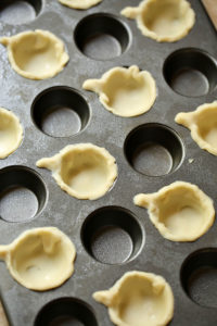 Press each circle into the mini muffin pan as shown; pinch any excess dough at the top to create your stem.